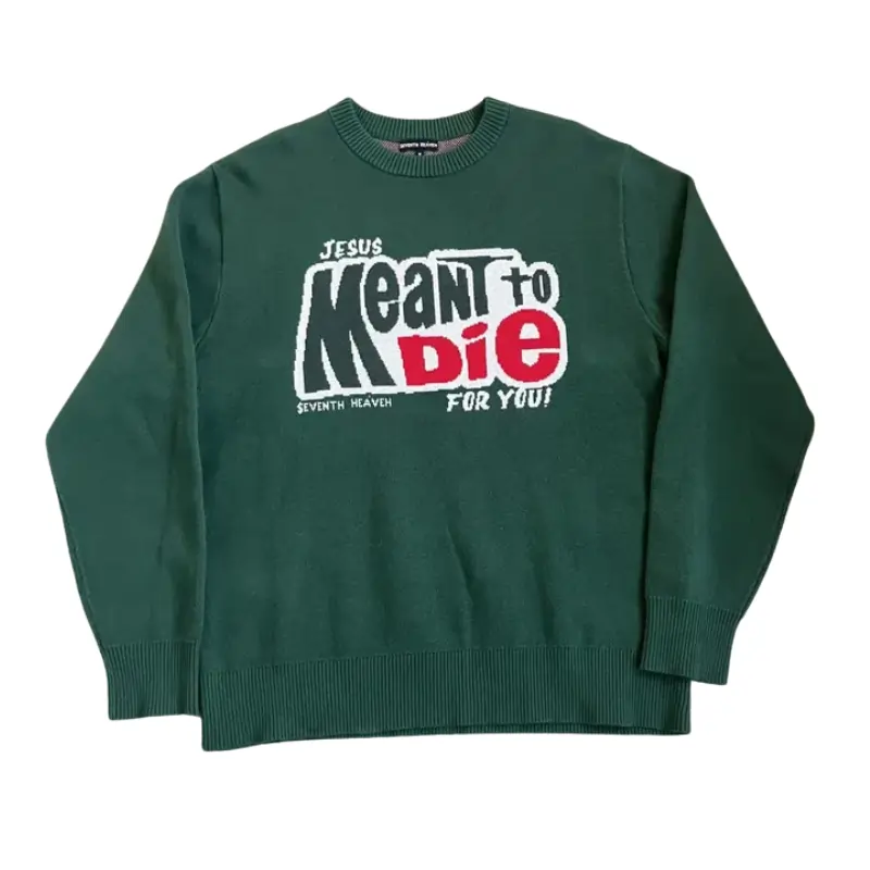 Our Green Seventh Heaven Meant to Die Knit Sweater is all about bold style with meaning. Made from soft cotton, it’s warm, comfortable, and perfect for layering. The intarsia-knit graphic reads, “Jesus Meant to Die for You!” in striking black, white, and red, making a powerful statement.