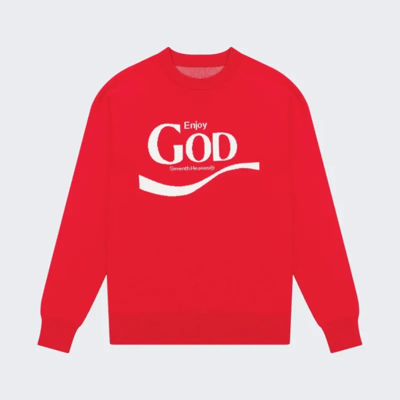 This Red Seventh Heaven Enjoy God Knit Sweater blends bold design with a cozy knit. The front features a striking “Enjoy God” graphic, while the back carries the brand’s signature touch. Its heavyweight knit offers warmth, making it perfect for cooler days.