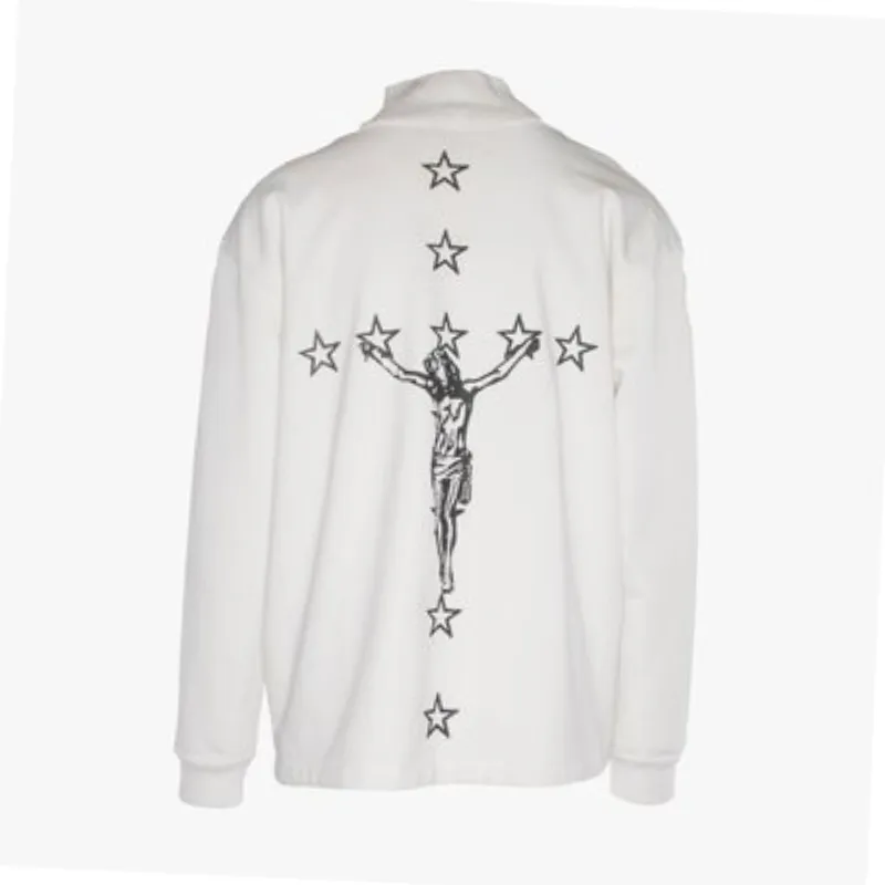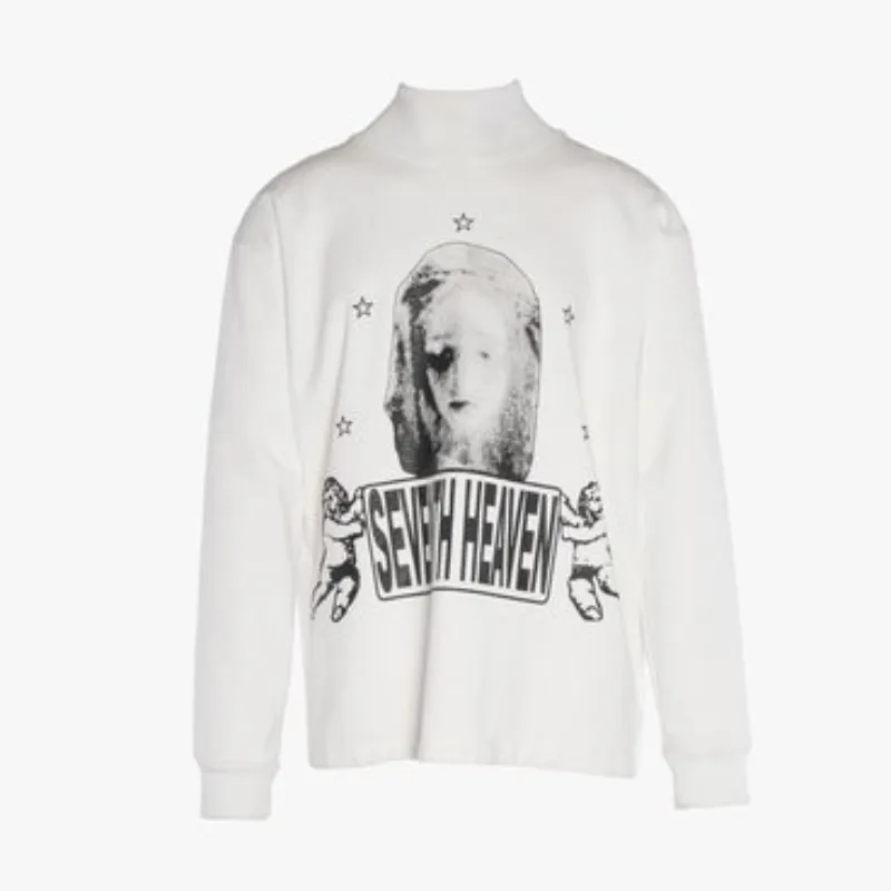 This White Seventh Heaven High-Neck Sweatshirt delivers a bold, artistic edge with a striking front graphic. A distressed face motif, cherubs, and gothic lettering create a raw, statement look. The high neckline adds a modern touch, while the relaxed fit ensures laid-back wear.