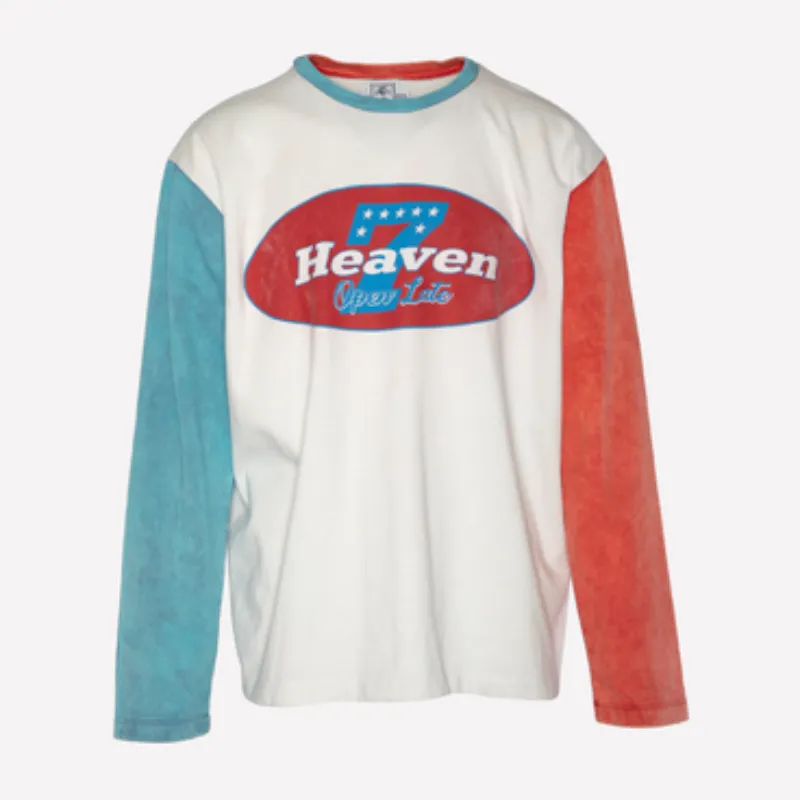 Our White Seventh Heaven Open Late L/S Tee brings bold vintage vibes with a modern edge. Its color-blocked sleeves add a playful contrast, while the distressed “7 Heaven Open Late” graphic gives it a worn-in, retro feel. The soft fabric keeps it comfortable for all-day wear, and the relaxed fit makes layering easy.