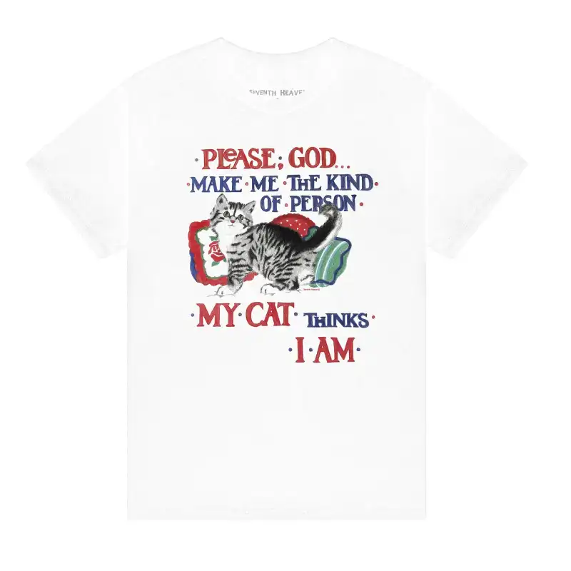 The White Seventh Heaven Please God Tee blends meaningful expression with everyday streetwear appeal. Designed with a bold front graphic, it features the statement “Please God, Make Me the Kind of Person” paired with a distinctive cat illustration that adds character and depth. Crafted from soft, breathable cotton, this tee offers all-day comfort while maintaining a clean, modern fit. The crisp white base enhances the graphic’s impact, making it easy to style with jeans, cargos, or layered looks.